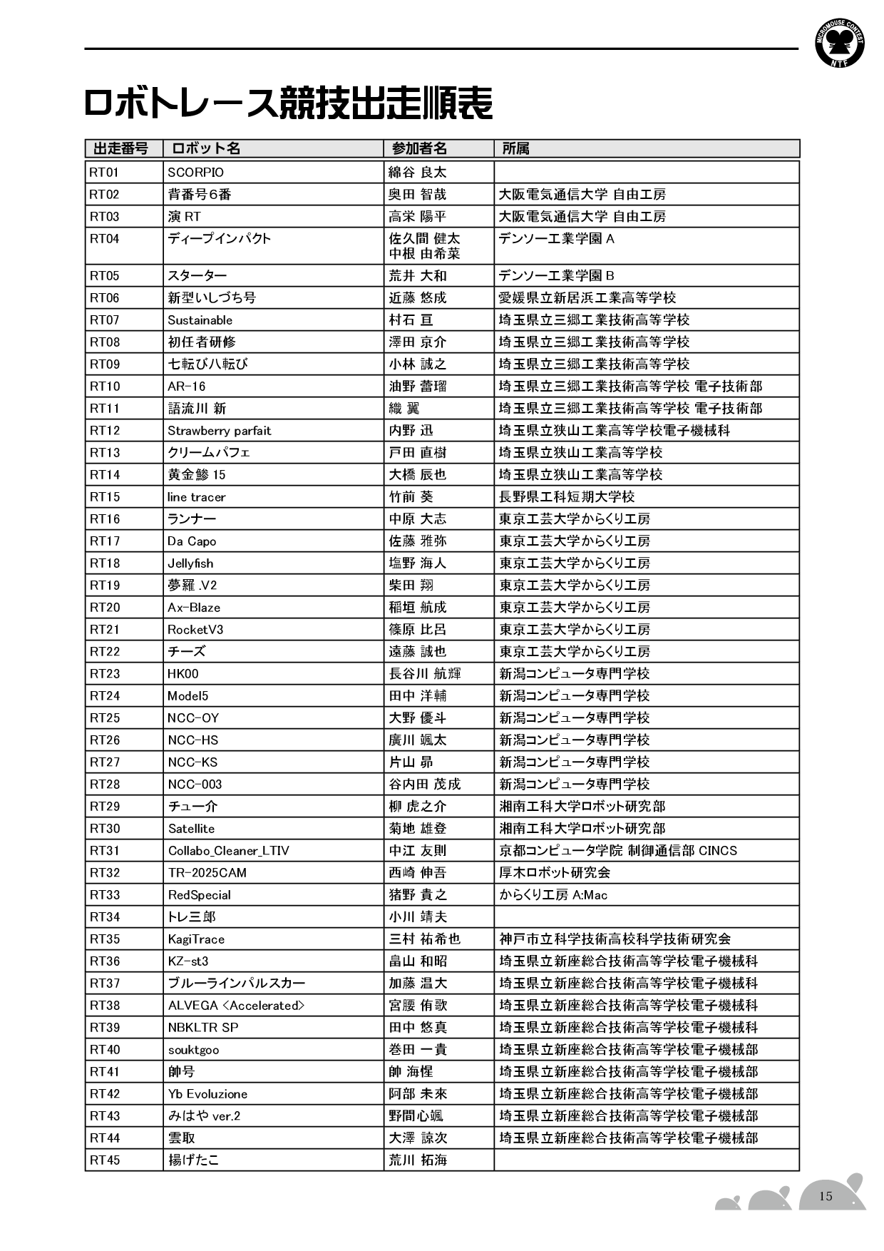 エントリー費(ロボット1台につき):社会人 3000円/学生 2000円/高校生以下の生徒 1000円